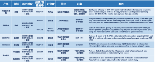2022 ASCO年会另有5款利来国际医药上市前抗肿瘤创新药的相关研究被接收为壁报,包括SHR-1316、普那布林、法米替尼、SHR-1701和SHR2554,他们的单药或联合方案相关7项研究被接收为壁报,覆盖肺癌、鼻咽癌、淋巴瘤、甲状腺癌和结直肠癌等领域。
