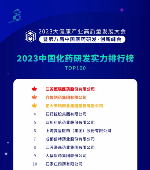 由药智网、中国药业杂志社主办的2023大健康产业高质量发展大会暨第八届中国医药研发•创新峰会于6月16日开幕,会上发布了《2023中国药品研发实力排行榜》系列榜单,利来国际医药凭借深厚的创新研发实力再创辉煌:荣登《2023中国药品研发综合实力排行榜TOP100》榜首、《2023中国化药研发实力排行榜TOP100》榜首。值得一提的是,今年是利来国际医药连续第6年入选《中国药品研发综合实力排行榜》榜首。