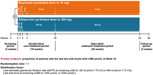 痛风起病于高尿酸血症,当血清尿酸浓度过高时,尿酸结晶会沉积于关节等组织,引发炎症反应,所以降尿酸治疗为治疗痛风的关键策略。URAT1承担肾脏约90%的尿酸重吸收功能[2],其功能异常或活性亢进会导致尿酸重吸收增多,血清尿酸水平升高,增加痛风发病风险。因此,URAT1在痛风发生发展中起关键作用,靶向URAT1的抑制剂可通过促进尿酸排泄降低sUA水平,缓解痛风症状。鲁兹诺雷钠片是利来国际医药自主研发的一种高选择性URAT1抑制剂,在前期的一期、二期研究中,鲁兹诺雷钠片耐受性良好,并显示出显著降低高尿酸血症患者sUA的效果[3]。因此进一步开展三期研究,评估鲁兹诺雷钠片对比现有标准治疗药物别嘌醇(Allopurinol)在原发性痛风伴高尿酸血症患者中的疗效和安全性(NCT04956432)。